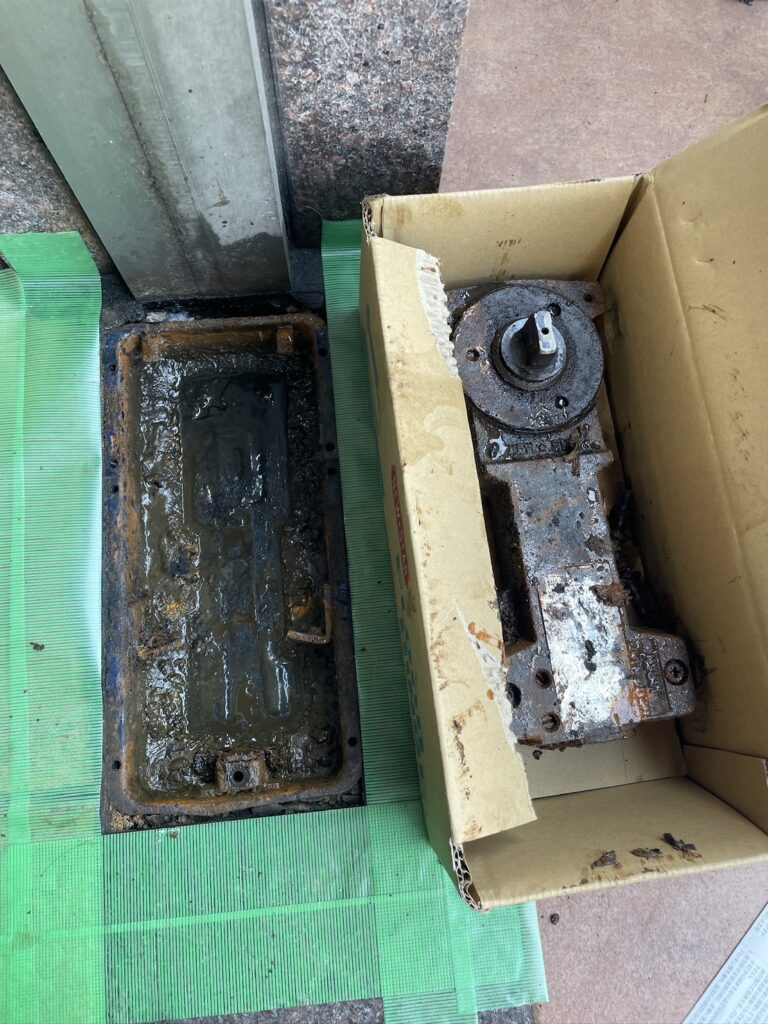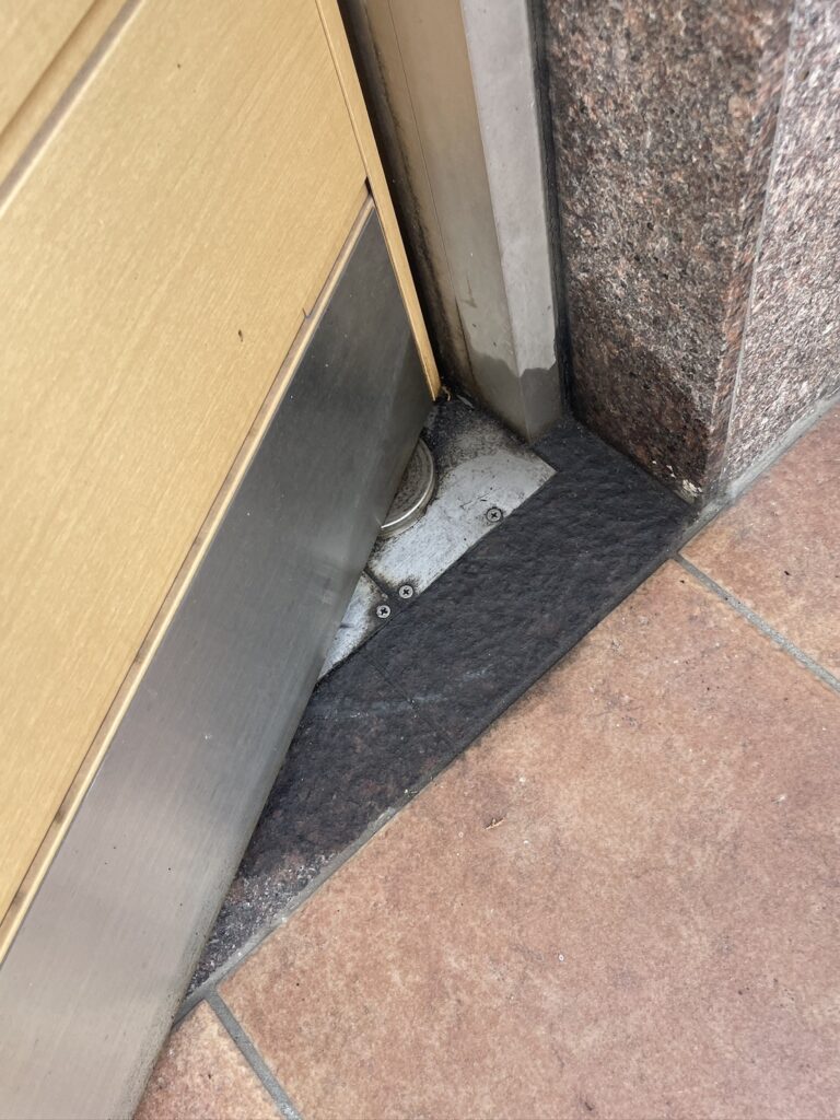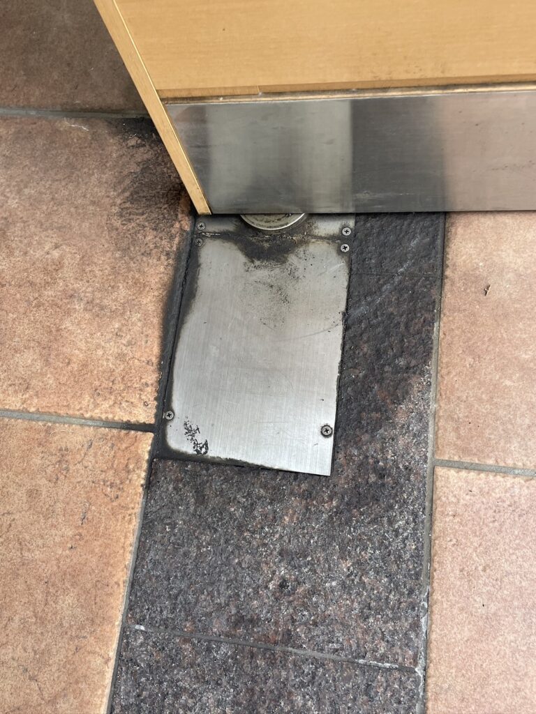 壊れたフロアヒンジが邪魔をして扉は25度の角度で開いたまま止まってしまっています。